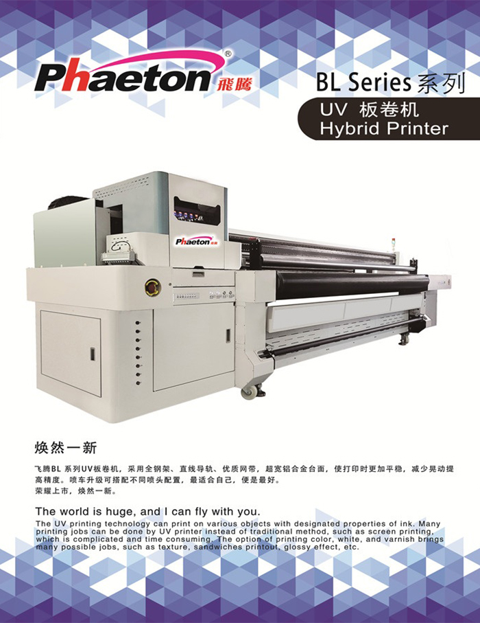 飛騰BL系列UV板卷機,采用全鋼架、直線導軌、優質網帶,超寬鋁合金臺面,使打印時更加平穩,減少晃動提 高精度。噴車升級可搭配不同噴頭配置,最適合自己,便是最好。 榮耀上市,煥然一新。
